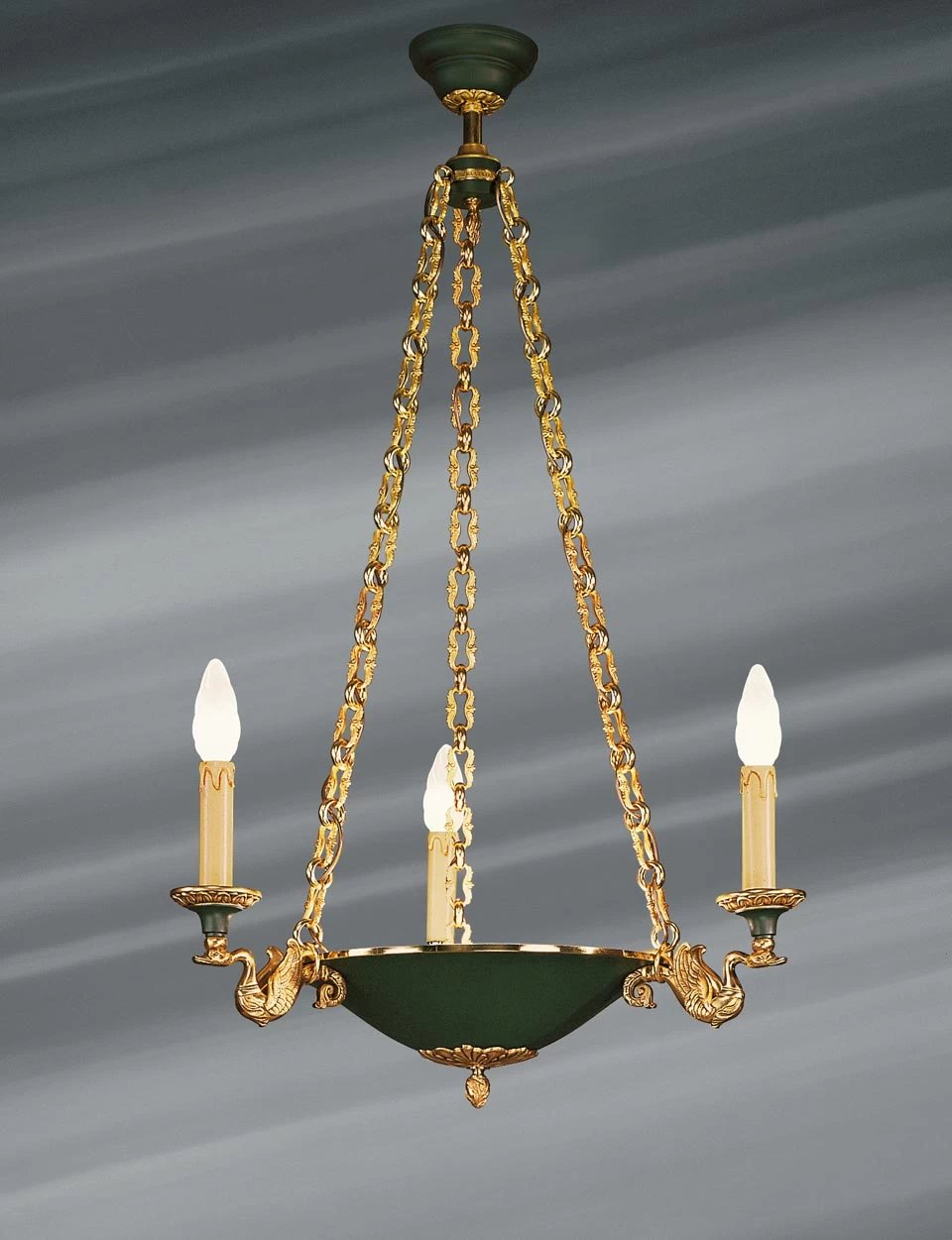 Brillance dans l’esprit de l’ornementation Empire accentuée par la finition or vif et laquée en vert de ce lustre en bronze massif, en forme de vasque ornée trois lumières. Ici les lumières sont portées par des cygnes triomphants. L’éclairage s’effectue de façon direct et indirect, avec une puissante source de lumière halogène dans la vasque. Les maillons de la chaînes, très travaillés, de forme torique, viennent se rejoindre sur le cabochon laqué qui se fixe au plafond. Le bas du lustre est orné d’une petite flamme entourée d’une corolle de palmes. Le tout forme un ensemble élégant et imposant, parfaitement réalisé par les artisans d’art de la Maison Lucien Gau, Bronzier d’art depuis 1860.