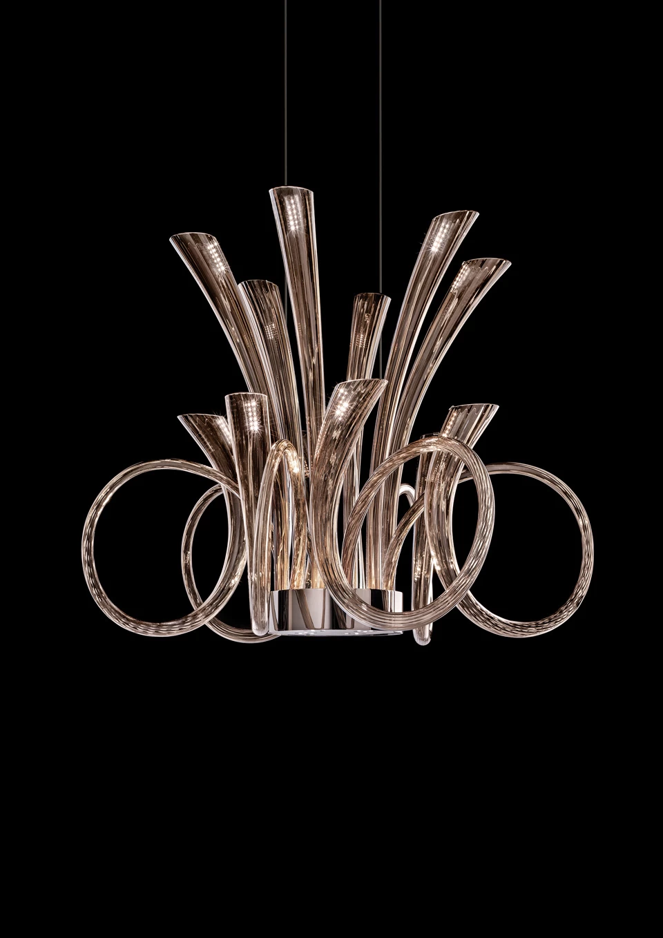Pulse est un lustre contemporain en verre soufflé en verre taupe. Les éléments en verre, de la forme de cornes d’abondance, sont en sculpté, sont retenus par un anneau de métal couleur canon de fusil et le support de plafond rond est en métal assorti. Le puissant éclairage LED éclaire à la fois vers le haut en éclairage indirect et vers le bas en éclairage direct. Ce lustre est idéal en éclairage principal au milieu d’une grande pièce. Ce luminaire est entièrement réalisé à la main par des maîtres verriers en Italie et il est également proposé en blanc sous la référence 18050057.