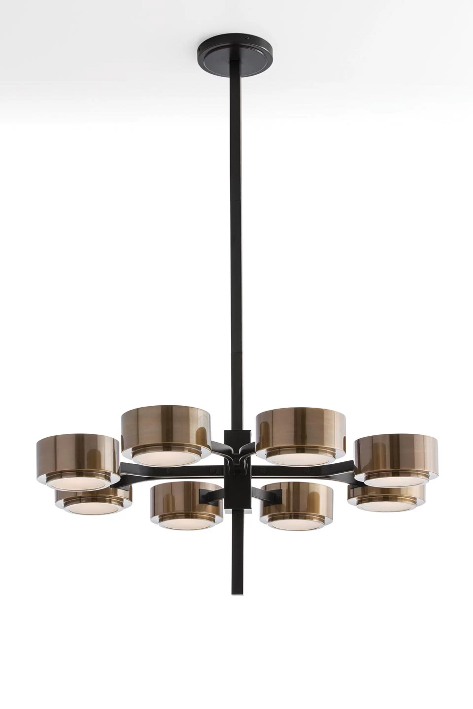 Original, le lustre Jalen 8 lumières est équipé de spots en laiton vieilli, offrant une lumière directe adoucie par un verre dépoli. Le contraste entre les supports de lumière et la structure est assuré par la finition noire et bronze. La section carrée de la tige, du support central et des bras s’oppose également à la rondeur des diffuseurs. La tige de suspension est composée de 2 éléments de 30cm et 1 élément de 15cm. Des éléments supplémentaires peuvent être commandés en option, nous consulter. Le cône de plafond cylindrique est assorti à la structure. Ce lustre possède une protection Classe I, il doit être lié à une connexion terre et peut être installé dans une pièce humide ou une salle de bains à plus de 60cm d’un point d’eau. Arteriors nous montre une nouvelle fois ici, sa capacité à capter les tendances du moment et nous proposer les modèles dont nous avons envie.