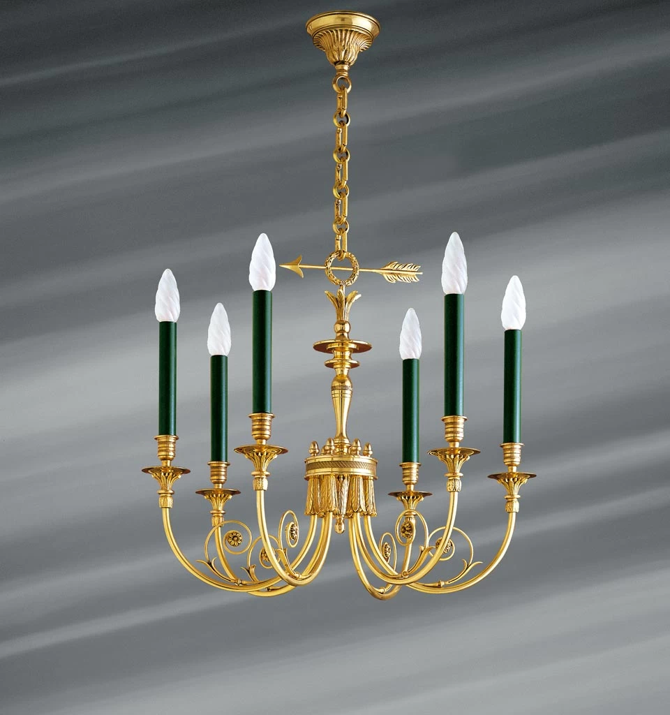 Grand travail de décoration pour ce lustre en bronze massif de style Directoire. Ses six bras fins portant lumières sou tendent des bassins sculptés. Une flèche magnifiquement exécutée surplombe l’ensemble et une rangée de pompons entourent le cercle d’où partent les bras du lustre. Travaillé tout en brillance et en éclat, l’or vif de la finition met parfaitement en valeur cet ensemble exécuté entièrement manuellement par les artisans d’art de la maison Lucien Gau, dans le respect d’une tradition française séculaire. Ce lustre existe aussi en une dimension plus petite, en quatre lumières visible sous la référence 16060093 ainsi qu’une double applique assortie visible sous la référence 16060095.