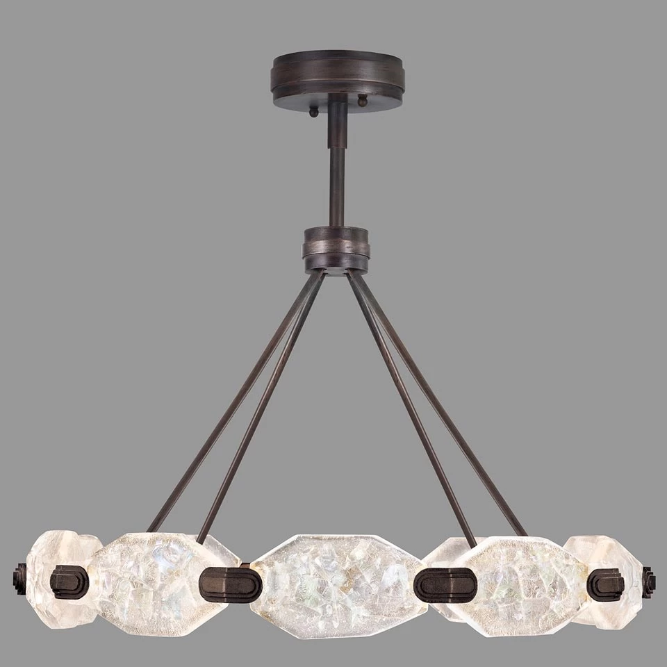 Beaucoup de classe pour ce lustre de l’artiste Allison Paladino à la structure circulaire en métal sur trois bras, la finition est en bronze patiné. Sur cette structure sont disposés dix cristaux dichroïdes taillés en hexagone. La lumière de cette magnifique suspension est produite par une série de modules LED, et garantit un éclairage doux et agréable. Une collection toute de cristal, étincelante d’une lumière crépusculaire, pâle comme l’Arctique, qui ondule comme une aurore boréale. Le verre dichroïque, développé par la NASA, est fabriqué et taillé dans les ateliers de Fine Art Lamps en collaboration étroite avec le sculpteur de verre Frank Eglesby. La ligne allie finitions impeccables d’or, d’argent ou de bronze avec des cristaux hexagonaux qui s’intègrent chacun de maniée unique aux luminaires car taillés individuellement. La marque frappe une nouvelle fois par sa capacité à transformer la lumière en véritable œuvre d’art. La ligne comprend dix autres suspensions (16090028, 16090029, 16090037, 16090038, 16090039, 16090040, 16090041, 16090042, 16090049, 16090050, 16090051) et six appliques (16090031, 16090032, 16090033, 16090034, 16090035, 16090036).