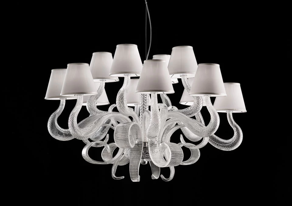 Un lustre BOA très moderne dont les bras sont entièrement fait de serpents de verre transparent et sculptés en torsades supportant 12 abat-jour coniques en tissu ivoire gansé argent. Le fond et le fût sont également en verre sculpté et la structure en métal chromé. Des volutes en verre strié ornent le bas du lustre et reflètent l’éclat des 12 lumières portées. Le pavillon (ou cône de plafond) est cylindrique et également en métal chromé. Ce lustre est entièrement fabriqué à la main par des maître verriers, en Italie.