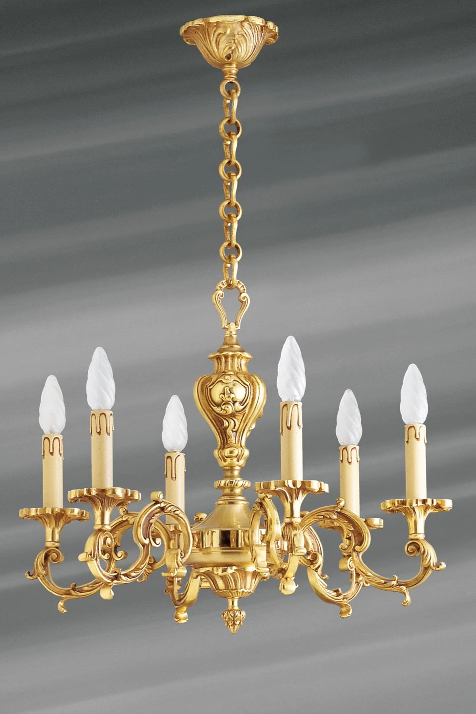 Muni de six lumières, ce lustre doré Louis XV comprend une partie centrale en forme de vase, dont le galbe est très élégamment souligné de divers motifs concentriques. Les six bras recourbés sont décorés de façon assortie, et se terminent en volute resserrée. Chaque bougeoir est muni, à sa base, d’un bassin en forme de chanterelle et orné de stries. Ce lustre n’est pas équipé de bobèches. Fabriqué en bronze massif, il est fabriqué à la main dans les ateliers français de Lucien Gau. Sur le bronze est appliquée une patine vieil or. Ce lustre ne mesure que 65cm de hauteur hors chaîne, et peut donc être fixé sous des hauteurs de plafond à partir de 2m70. Un modèle à cinq lumières au dessin quasiment identique est également disponible sous la référence 12020252, deux autres modèles à la partie centrale plus arrondie sont aussi sous les référence 12020284 (six lumières) et 12020243 (cinq lumières).