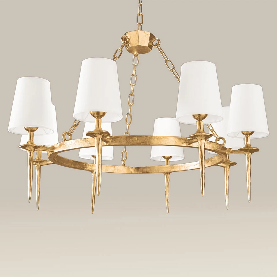 Un air solennel presque médiéval avec ce superbe lustre 8 lumières Mancha doré, tout de bronze massif finition or et abat-jour coniques blancs. Le modèle est constitué d’un anneau central sur lequel sont greffés les 8 lumières, faites d’un bras vertical prolongé d’un bassin en soucoupe surmonté des « chandelles », quant à elles coiffées chacun d’un joli abat-jour conique de taffetas blanc. Le lustre est équilibré par trois chaines qui sont reliés à un point central suspendu à une chaine fixée au plafond. Remarquez la superbe finition dorée obtenu par un premier travail de polissage du bronze, qui créé un contraste entre les arrêtes rendue brillantes et les creux naturels du métal laissés mats. Le métal est ensuite recouvert par électrolyse d’une fine couche régulière d’or.