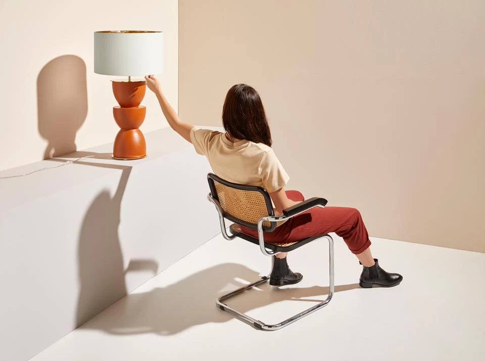 Retrouvez la pâte originelle de la maison Aromas avec ce modèle de lampe de table Metric, dotée d’un pied formé de trois éléments de céramique couleur brique qui évoquent la forme d’un sablier stylisé, ainsi que d’un socle rond et un tube en laiton poli, surmonté d’un large abat-jour cylindrique en chintz blanc. Modèle au style intemporel, Metric trônera avec élégance sur un bureau comme au pied d’une bibliothèque. Le câble d’alimentation est transparent. La maison espagnole Aromas, fondée à Valence dans les années 1980, produit d’élégants et intemporels luminaires dans un style contemporain affirmé, tout en travaillant à partir de matériaux et techniques traditionnels, tel le marbre, la céramique ou le bois.