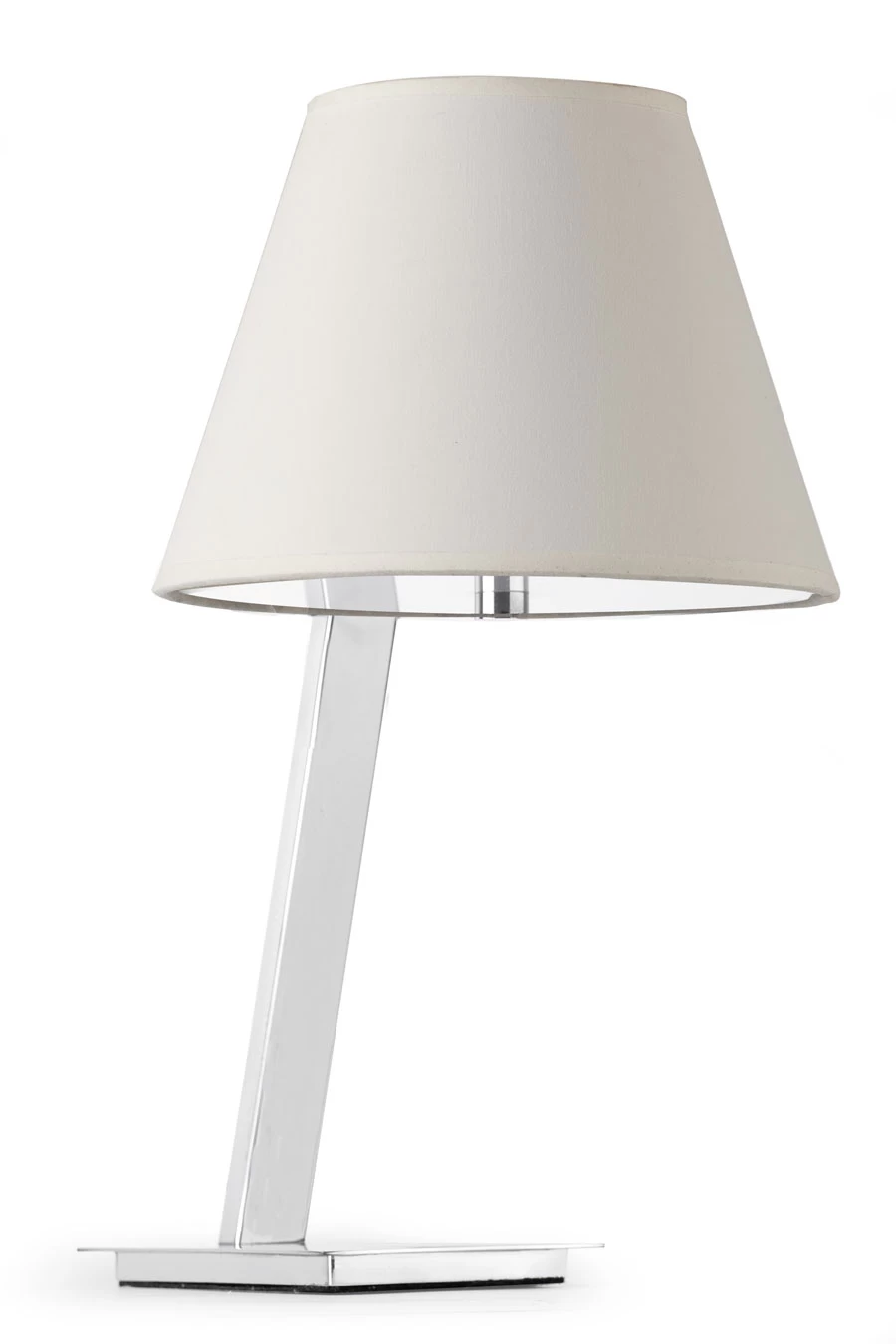 Cette lampe de table design chrome et abat-jour blanc appartient à la collection Moma, une gamme de luminaires sobres, classiques tout en ayant une touche de modernisme avec leur axe incliné. Les socles et pieds sont en acier chromé, l’abat-jour est en tissu noir ou blanc. Il y a dans la gamme Moma une lampe de table, un lampadaire, et deux modèles d’applique. Tous les luminaires sont équipés d’interrupteur. Lampes et lampadaires sont équipés d’un diffuseur en PVC, qui adoucit la lumière et permet de cacher l’ampoule. Grâce à leur construction très solide, ces luminaires en chrome de la collection Moma sont très prisés en hôtellerie de luxe.