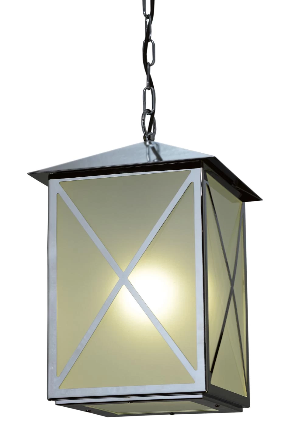 Très jolie lanterne suspendue Monterey, dans un style classique actualisé par une finition en acier inoxydable. C’est un modèle en forme de petite maison coiffée d’un toit, et des vitres en verre poli au sable protégées par des croix de métal. Le verre sablé diffuse agréablement la lumière et masque l’ampoule. C’est un modèle solide grâce à l’inox, suspendu sur une chaine assortie.