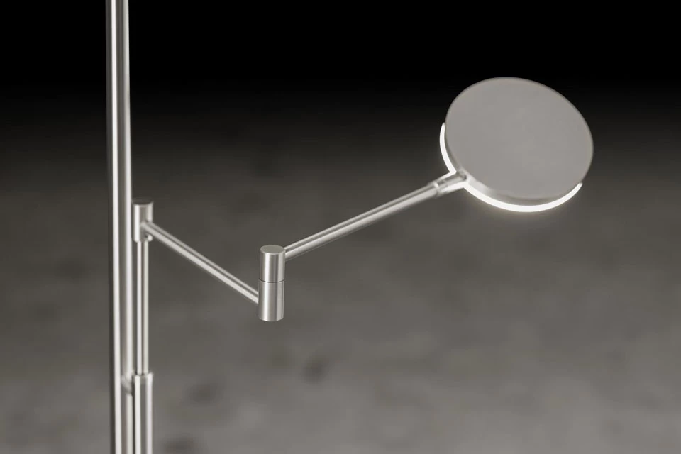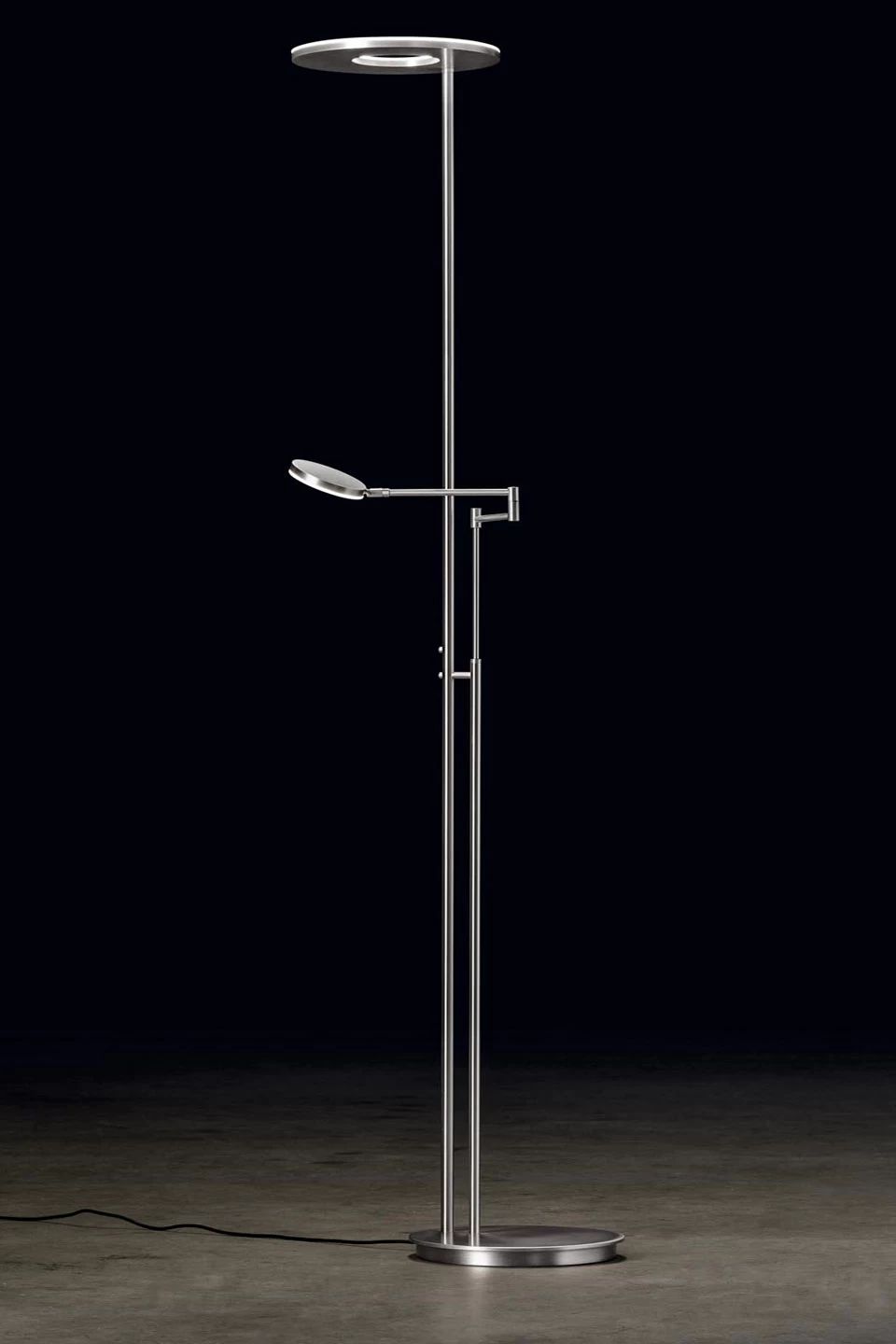 Superbe lampadaire 2 lumières aluminium mat au puissant éclairage LED intégré et modulable de la série au design contemporain Nova. Doté d’un profil épuré et élégant, le modèle se compose d’un socle rond surmonté de deux pieds en tube de métal droit, l’un de 185cm de hauteur est équipé d’un grand plateau avec module LED sur la face supérieure, projetant la lumière vers le plafond, et l’autre pied plus petit (mais dont la hauteur est réglable) est quant à lui équipé d’une liseuse sur bras horizontal en deux sections chacune montée sur rotule permettant de vastes possibilités de rotation horizontale et de disposition selon vos besoins. La liseuse est un petit disque métallique avec LED intégré, elle aussi orientable. L’ensemble est en métal avec finition aluminium mat. Non seulement réputée pour la qualité de ses luminaires fabriqués du métal brut au produit fini en Allemagne, la maison Holkoetter, fondée en 1964, concentre également son expertise sur le développement d’un éclairage LED précis, durable et tendant vers le vertueux en terme environnemental.