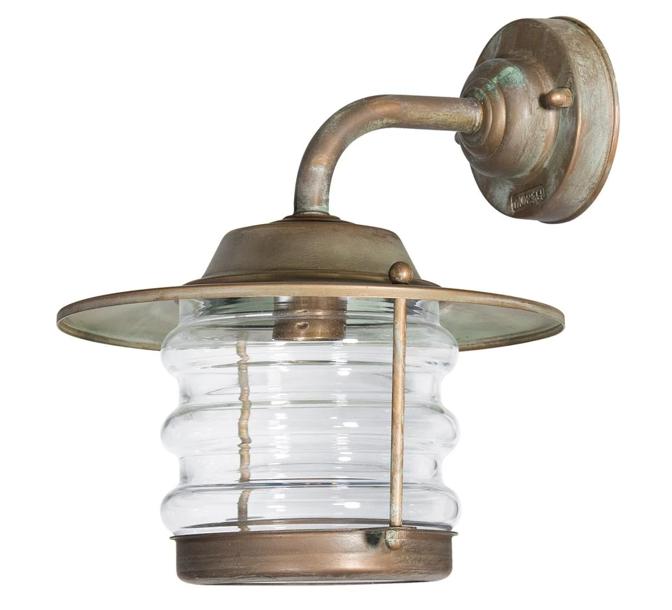 Une jolie applique d’extérieur Onda de la gamme Campagne, aux airs de lampion, avec sa lanterne en verre ondulé transparent et chapeau en laiton au bout d’un bras court à 90°, fixé sur un support mural rond. L’applique est réalisée en laiton avec une finition vieillie qui donne une patine authentique au modèle, parcourue de touches de vert-de-gris. Compact et élégant, équipé d’une protection IP44 qui, combiné au laiton massif d’excellente qualité utilisé par la maison Moretti, en fait un modèle solide et résistant aux intempéries.