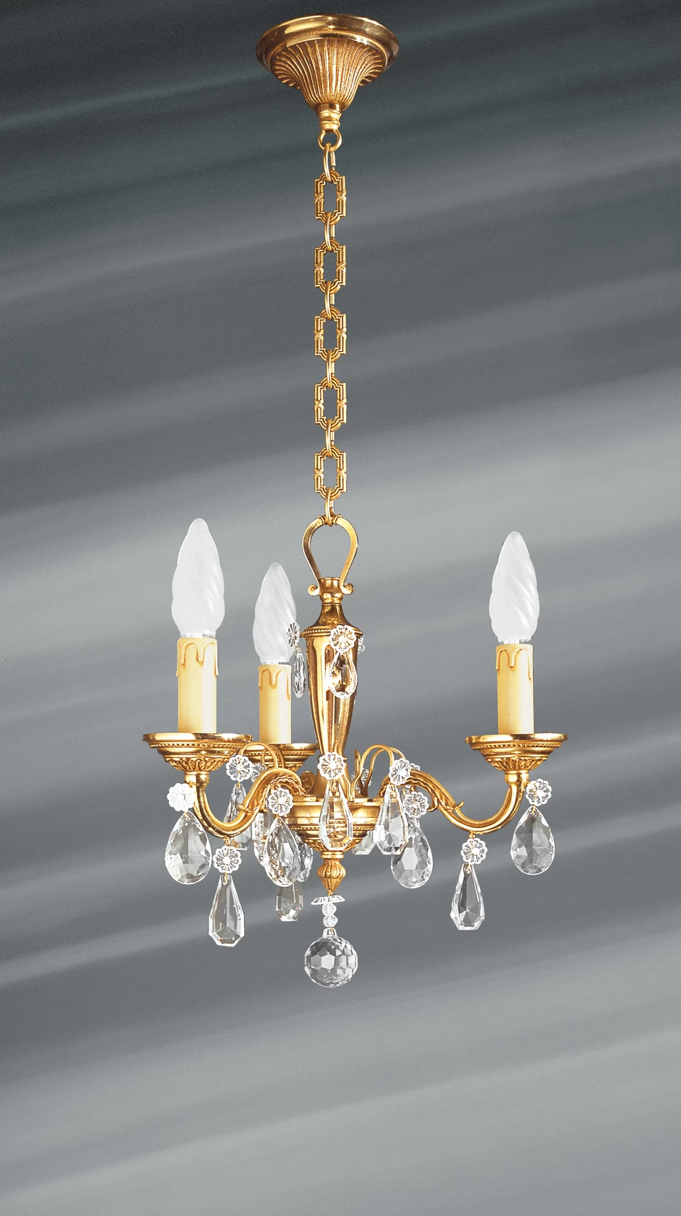 Très élégant petit lustre de style Louis XVI en bronze massif, merveilleusement ouvragé de feuilles et de nombreuses pampilles en cristal porte ses trois lumières au bout de ses bras en double volutes. Recouverts pour partie, de feuilles d’acanthe, ses bras supportent de très jolis bassins décorés de petites feuilles et surlignés de colliers de fines perles. Les pampilles en cristal sont très présentes et ornent délicieusement chaque niveau de ce lustre. Leurs formes varient entre goutte et poire et une très jolie et très travaillée boule de cristal vient compléter le surplomb du bourgeon terminant la partie inférieure de ce lustre. Le relief de son corps fin, élancé et cannelé est mis en valeur par la finition vieil or de son bronze et les reflets et transparence des pampilles et rosaces de cristal. La qualité d’exécution de son travail est exemplaire et entièrement manuel. Elle est le fruit du savoir faire des artisans de la maison Lucien Gau, fournisseur officiel des monuments historiques et châteaux français ainsi que des plus grands palaces du monde entier. Ce lustre est aussi disponible sans pampilles, visible sous la référence 16060065, en six lumières visible sous la référence 16060061 et peut être associé à des appliques assorties à une lumière visible sous la référence 16060062 ou à deux bougies sans pampilles visible sous la référence 16060063.