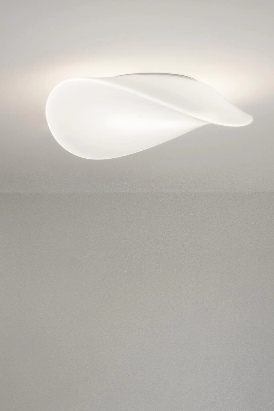 Superbe modèle dont le design délicat est inspiré par la trajectoire en ellipse de la terre autour du soleil, l’abat-jour du petit plafonnier Balance est fait d’une seule pièce de verre elliptique, en verre de Murano, dont la finition blanche et brillante crée une ambiance lumineuse pâle et agréable. L’ampoule est logée dans l’espace entre l’ellipse et le plafond.