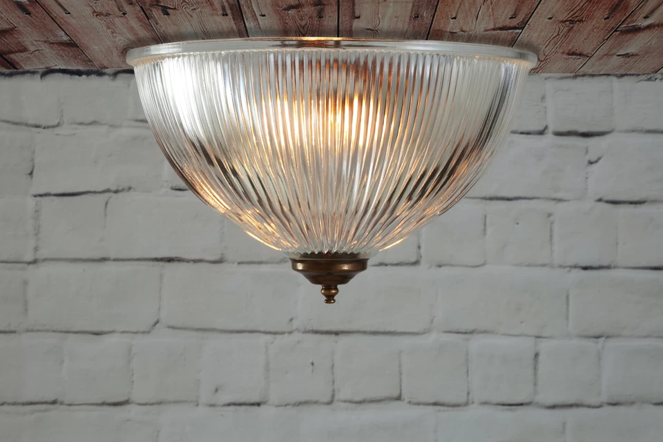 Classique, ce plafonnier en verre cannelé est en forme de coupole renversée retenue par une structure en laiton antique. Le réflecteur est en verre prismatique ce qui rend la lumière chaleureuse et agréable. Les cannelures se rejoignent autour d’une pointe en laiton antique. Mike Treanor crée des luminaires intemporels, qui seront les pièces maîtresses de votre intérieur qu’il soit vintage, industriel ou contemporain.