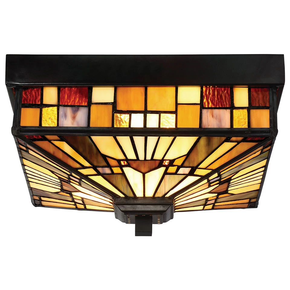 Superbe plafonnier d’extérieur Inglenook en Tiffany style Art Déco, avec son esthétique géométrique, son verre dans des tons chauds, sa structure en métal finition bronze et sa protection IP44. Le modèle est un assemblage à la main de pièces de verre coupées et colorées dans des tons de bleu saphir, d’ambre chaud et de crème, pour former ce plafonnier de format carré, doté d’une structure en métal finition bronze noir, dont la résistance aux intempéries et conditions d’extérieur est garantie par une protection IP44. Impeccable collection d’extérieur de la maison britannique Elstead Lighting, connue depuis le XVIIème siècle comme les forges Elstead, aujourd’hui alliant la perpétuation des techniques artisanales à une véritable modernité dans le design et la réalisation.