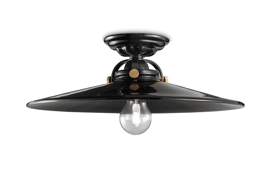 Ce plafonnier grand modèle C105 noir a beaucoup de charme et un style rétro chic. Il est entièrement en céramique vernie noire avec de petites attaches en métal doré mat. Le cône de plafond est en céramique coordonnée. Ferroluce est une entreprise familiale italienne heureuse de transmettre l’excellence de son savoir-faire pour les clients exigeants. Ce plafonnier existe également en petit modèle noir sous la référence 16050531 et blanc sous la référence 16050533.