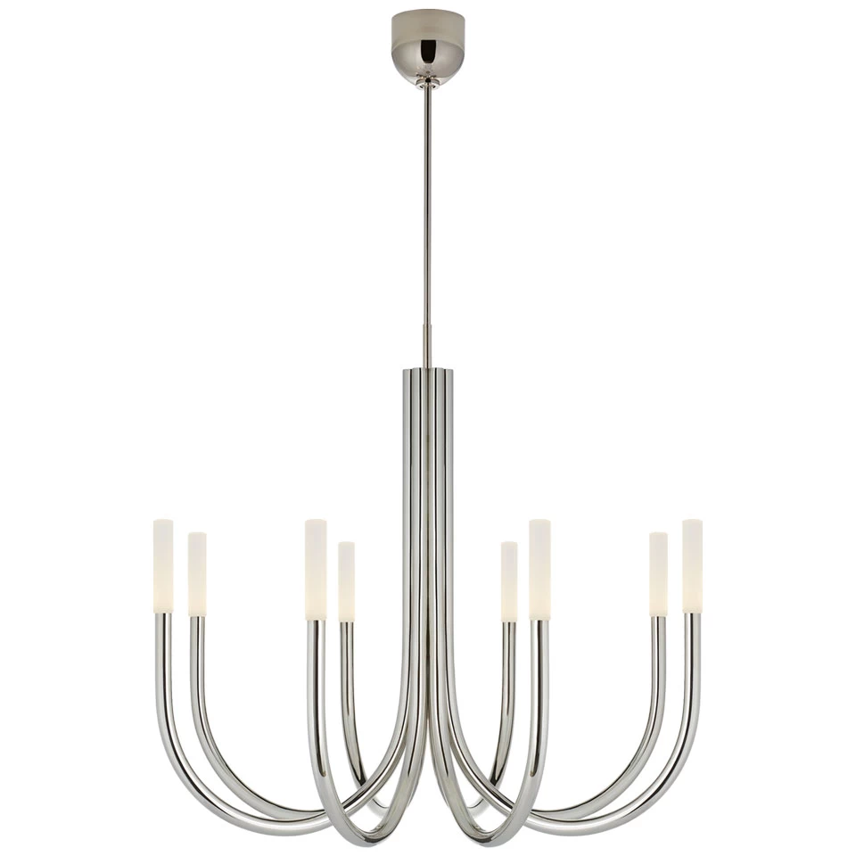 Le lustre chandelier moderne 8 lumière Rousseau est un modèle qui apporte une touche de modernité avec sa structure métallique argentée finition nickel poli et son éclairage LED intégré. Le modèle, qui joue sur un effet de symétrie, est doté d’un support de plafond bombé, d’une tige de suspension reliée à 8 bras rayonnant en étoile autour du point central, avec cette superbe finition nickel poli qui donne cette patine argentée miroir au lustre. L’extrémité de chaque bras est équipée d’un court diffuseur en tube de verre qui intègre un module LED diffusant une lumière blanche éclatante. Rousseau est parfait pour un salon, une salle à manger, ou toute grande pièce de réception. Ce luminaire est une création de la célèbre designer américaine Kelly Wearstler qui collabore avec la marque depuis de nombreuses années.