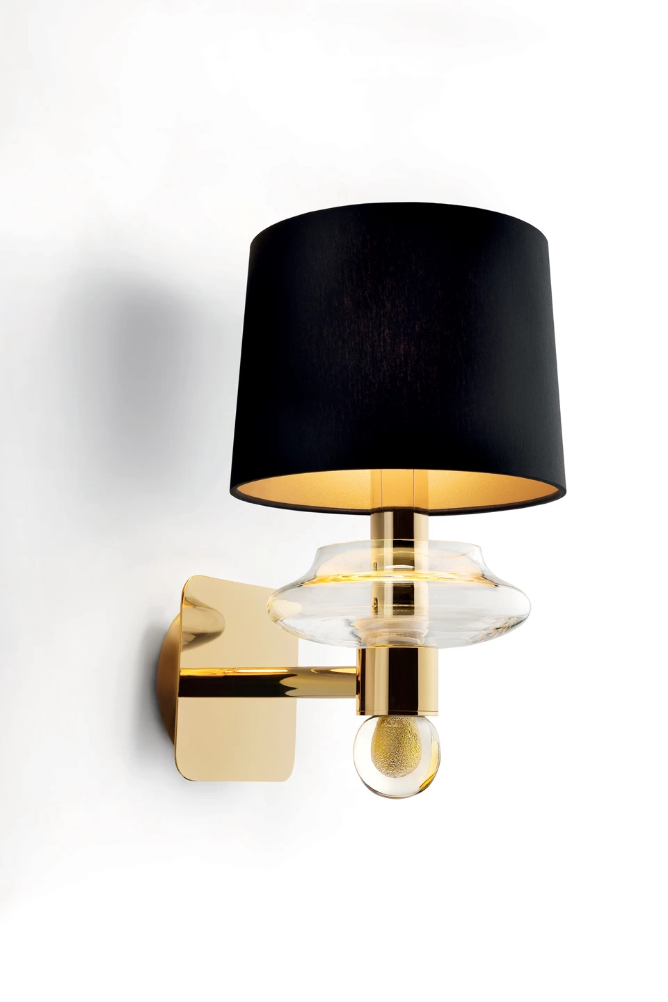 Petite applique compacte Saint Germain, un style classique élégant avec son bras en métal doré brillant, son abat-jour noir doublé d’or et ses éléments de cristal vénitien. L’applique est composée d’un support mural carré aux angles arrondis sur lequel est fixé un bras en angle droit en métal doré, surmonté d’un bel abat-jour cylindrique en coton noir doublé d’or. L’originalité du modèle réside dans son bassin en cristal transparent aux proportions harmonieuses, qui rappelle le design du chandelier traditionnel, et surtout la sphère de cristal transparente qui contient une bulle d’or, réalisée selon la technique de « oro sommerso » typique des maîtres verriers vénitiens. Le luminaire est un design de la maison Barovier & Toso, issue d’une longue lignée de maîtres verriers qui remonte au 14ème siècle, perpétue la tradition et les savoir-faire familiaux, tout en ayant introduit une esthétique innovante dans la discipline du travail du verre de Murano.