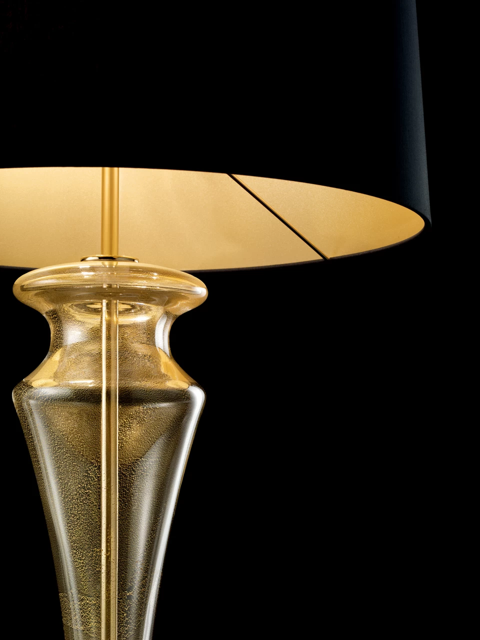Une superbe lampe de table Saint Germain au design rétro, faite de métal doré, cristal vénitien et abat-jour noir, ainsi que le détail de la boule « oro sommerso », technique typique des maîtres-verrier de Murano. La lampe est composée d’un socle rond et pied droit en métal avec une finition or galvanisé, et le pied est habillé d’un élément de cristal d’une magnifique couleur violette, le tout coiffé du large abat-jour cylindrique noir. L’originalité du modèle réside dans la sphère de cristal transparente qui contient une bulle dorée, elle surmonte l’abat-jour et donne l’impression d’un astre lumineux qui flotte au-dessus de la lampe. Le luminaire est un design de la maison Barovier & Toso, issue d’une longue lignée de maîtres verriers qui remonte au 14ème siècle, perpétue la tradition et les savoir-faire familiaux ainsi que la place maîtresse de la maison, tout en ayant introduit une dimension moderniste et une esthétique innovante dans la discipline du travail du verre de Murano.