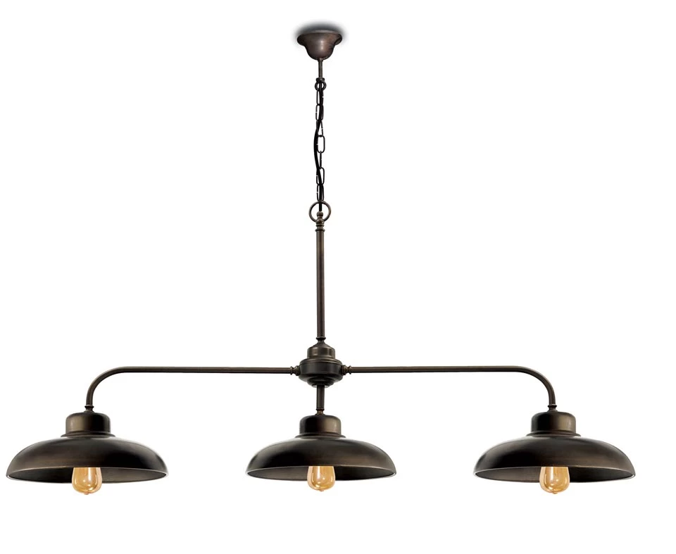 Superbe finition laiton bruni pour ce modèle vintage de suspension 3 lumières issu de la collection Samoa, composée de trois abat-jours en cloche ronde fixés à hauteur égale sur un bras en trident fait de tubes de métal suspendu sur une chaine courte reliée au cône de plafond. Le modèle est entièrement réalisé en laiton moulé sous pression, et doté de cette belle patine qui tire vers le noir et confère une élégance certaine au modèle. La maison Moretti, particulièrement réputée pour la qualité du laiton massif moulé sous pression qu’elle travaille, livre une collection qui mêle d’élégants modèles d’intérieur et d’extérieur empruntant tant au style classique que campagne ou industriel.