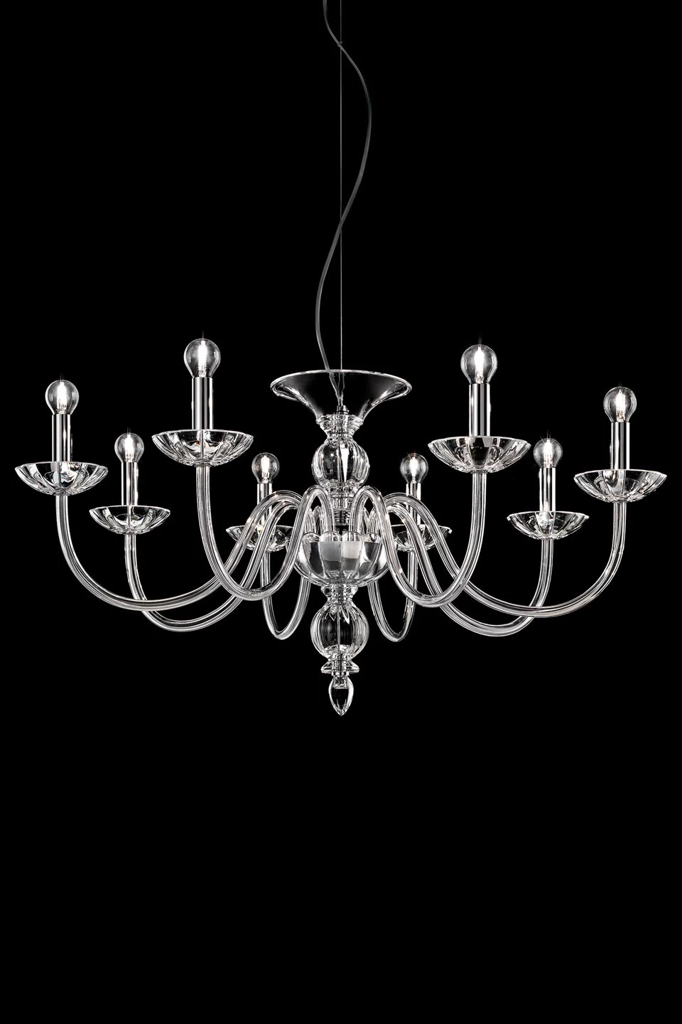 Superbe lustre contemporain Sirius 8 lumières qui adopte l’esthétique caractéristique du chandelier vénitien, tout de cristal transparent et structure en métal chrome pour la modernité. Le modèle est doté de 8 bras de cristal en col de cygne, qui se déploient depuis un enfilage central, chacun est doté d’un bassin en coupelle et d’un fourreau en métal finition chrome. Le cristal habille une structure de métal chrome, et le modèle est suspendu sur un câble métallique discret. Haut de seulement 48cm, son installation nécessite une hauteur sous plafond de 260cm, hauteur standard des maisons et appartements contemporains. La maison Italamp propose une diversité de collections qui mettent (littéralement !) en lumière et développent le riche héritage artisanal italien en matière de luminaire, avec la recherche de matériaux nobles et le mariage du classique et du contemporain en d’uniques designs.