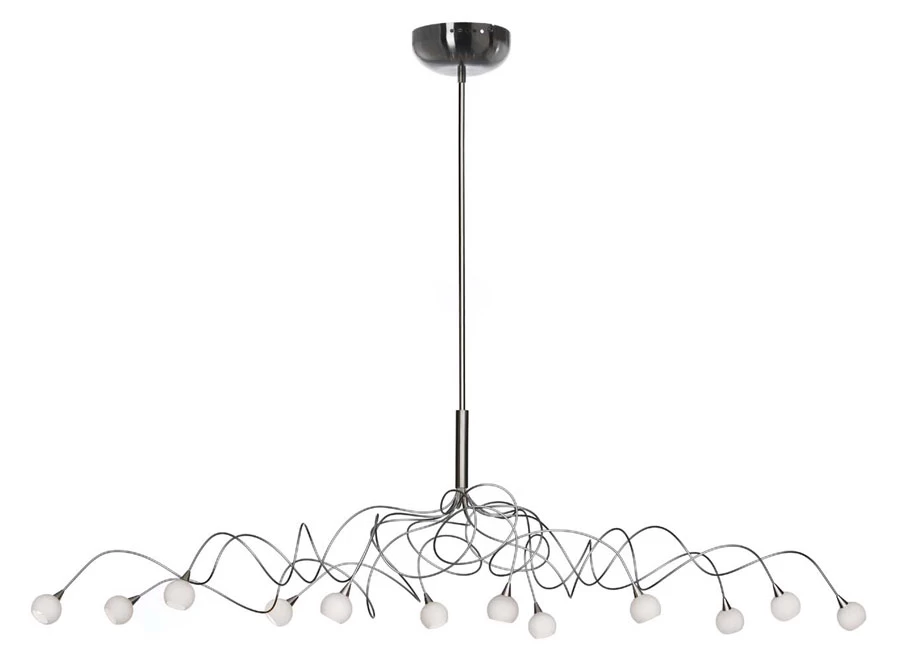 Le lustre ovale Snowball 12 lumières, avec petites verreries blanches en verre opale, est presque’ une sculpture tellement il est beau, éteint comme allumé. La gamme Snowball semble être portée par le vent. Les fils d’acier de 3mm courbés, donne une grande légèreté visuelle aux luminaires de cette gamme: lustre, plafonnier, appliques, lampes et lampadaires. Les petites verreries rondes au bout des fils d’acier sont en verre opale pour la Gamme Snowball. (La gamme Colorball propose les mêmes articles avec des verreries de même Dimensions en verre transparent)