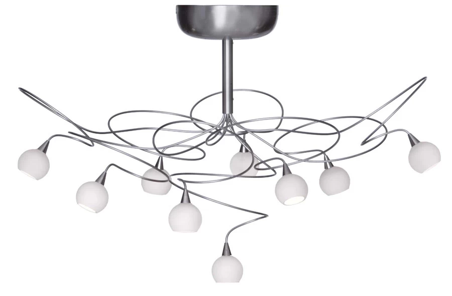 Le plafonnier Snowball 9 lumières, avec petites verreries blanches en verre opale, est presque’ une sculpture tellement il est beau, éteint comme allumé. La gamme Snowball semble être portée par le vent. Les fils d’acier de 3mm courbés, donne une grande légèreté visuelle aux luminaires de cette gamme: lustre, plafonnier, appliques, lampes et lampadaires. Les petites verreries rondes au bout des fils d’acier sont en verre opale pour la Gamme Snowball. (La gamme Colorball propose les mêmes articles avec des verreries de même Dimensions en verre transparent)