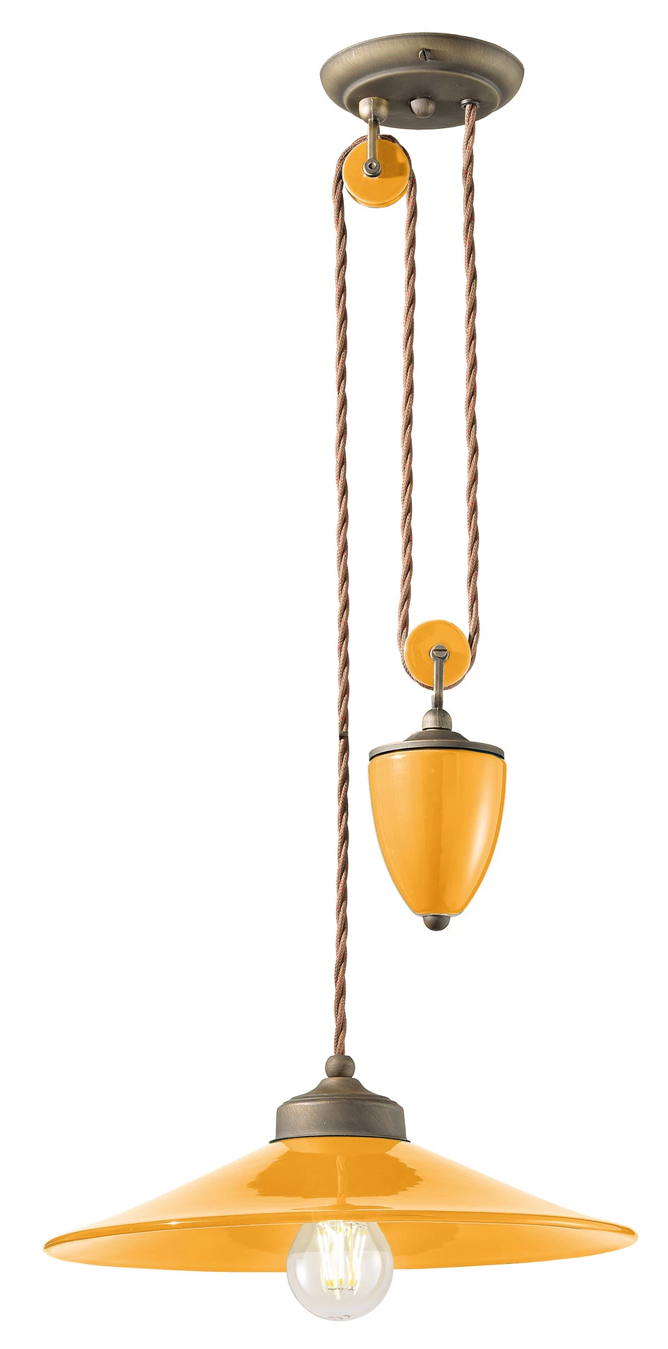 Une suspension Colors ingénieuse et pop, avec sa céramique émaillée jaune tonique, lisse et brillante, que l’on retrouve à la fois sur l’abat-jour, mais aussi sur le système de poulie et contrepoids qui rend intelligemment la suspension réglable en hauteur. Le cordon électrique d’une discrète couleur marron glacé est gainé et torsadé, et est relié à une platine de plafond en métal oxydé. Ferroluce est une maison italienne qui travaille la céramique depuis 50 ans, et qui réussit le pari de marier céramique traditionnelle à des formes de luminaires contemporaines et chics. La collection Colors décline ce modèle en différents coloris, bleu vintage (18070244), et crème (18070245).