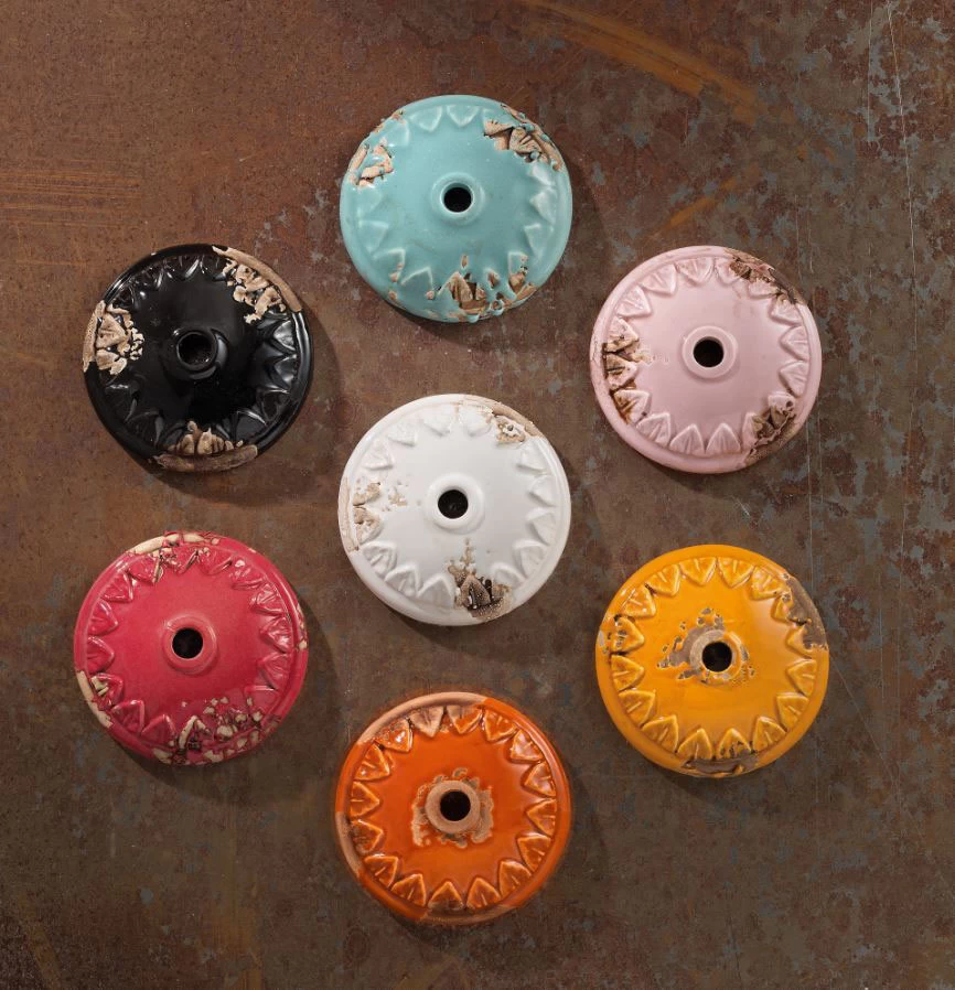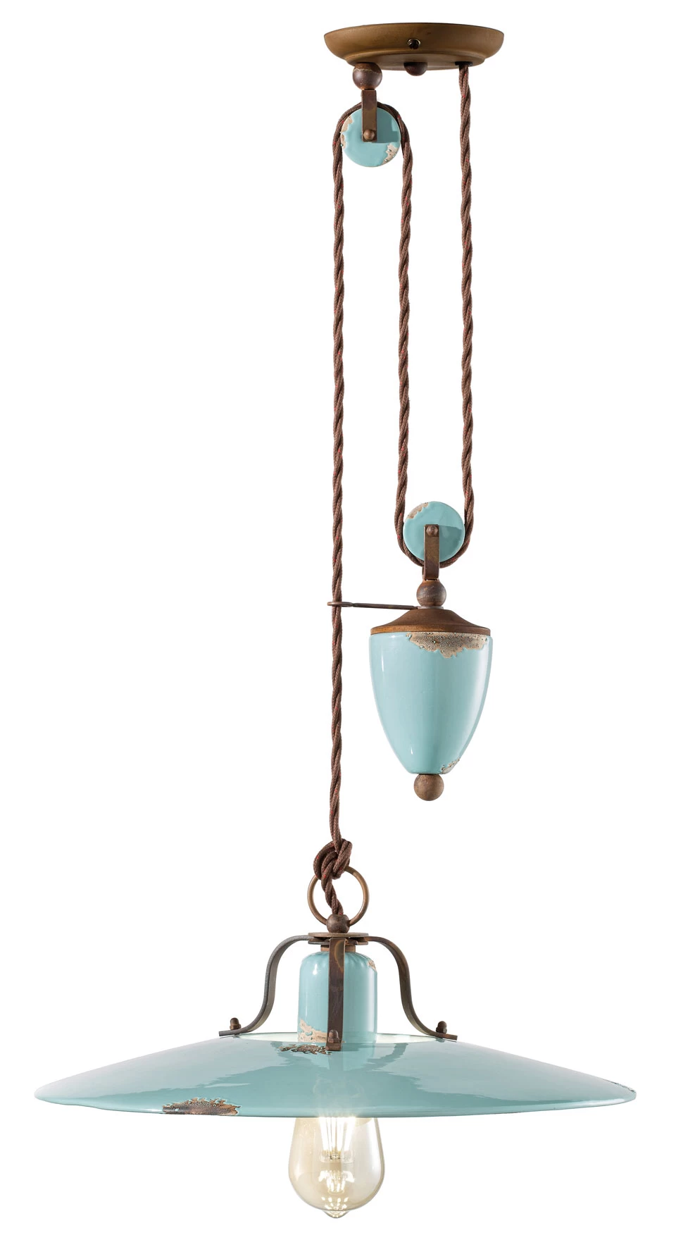 Cette suspension turquoise de style campagne issue de la collection Country, propose un système intéressant de poulie et contrepoids qui permet de régler la hauteur du luminaire. Il est composé d’un abat-jour en céramique écaillée à la main, équilibré par une pièce de métal rouillé, les poulies et la pièce qui sert de contrepoids sont également en céramique. Le câble d’alimentation est en tissu torsadé d’une discrète couleur marron glacé. L’ampoule est apparente et nous vous conseillons l’usage d’une ampoule décorative dite de navigation référence 11020153 avec ce luminaire. Ferroluce est une maison italienne qui travaille la céramique depuis 50 ans, et qui réussit le pari de marier céramique traditionnelle à des formes de luminaires industrielles et chics. Cette suspension peut être commandée dans les 7 coloris visibles sur le nuancier dans la seconde image sur cette page. Par défaut, le produit est en vert aqua, autres couleurs à préciser dans les commentaires du bordereau de commande. La collection Country comprend également un plafonnier décliné en vert sous la référence 18070236, et en noir sous la référence 18070234 et cette suspension est également visible en blanc sous la référence 18070232.