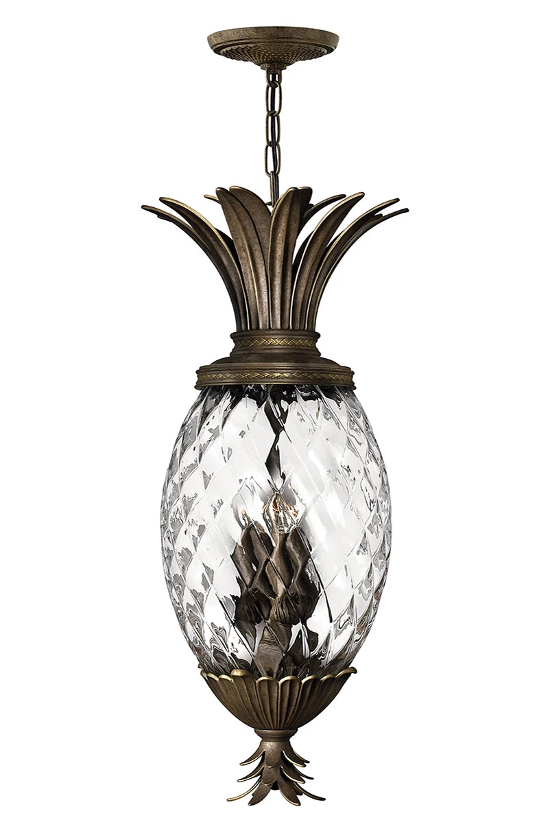 Ravissante suspension de la collection Plantation inspirée de l’ananas, avec son verre optique, sa couronne en métal finition bronze et son motif géométrique en losange. La suspension est composée d’un support de plafond rond moulé de motif en losange, d’une chaine, et d’un diffuseur en verre optique dont la surface imite celle de la peau d’ananas, avec une décoration en couronne d’ananas de part et d’autre de celui-ci. La finition bronze donne une patine authentique au modèle. L’impeccable fabrication est celle de la maison britannique Elstead lighting, connue depuis le XVIIème siècle comme les forges Elstead, aujourd’hui alliant la perpétuation des techniques artisanales à une véritable modernité dans le design et la réalisation.