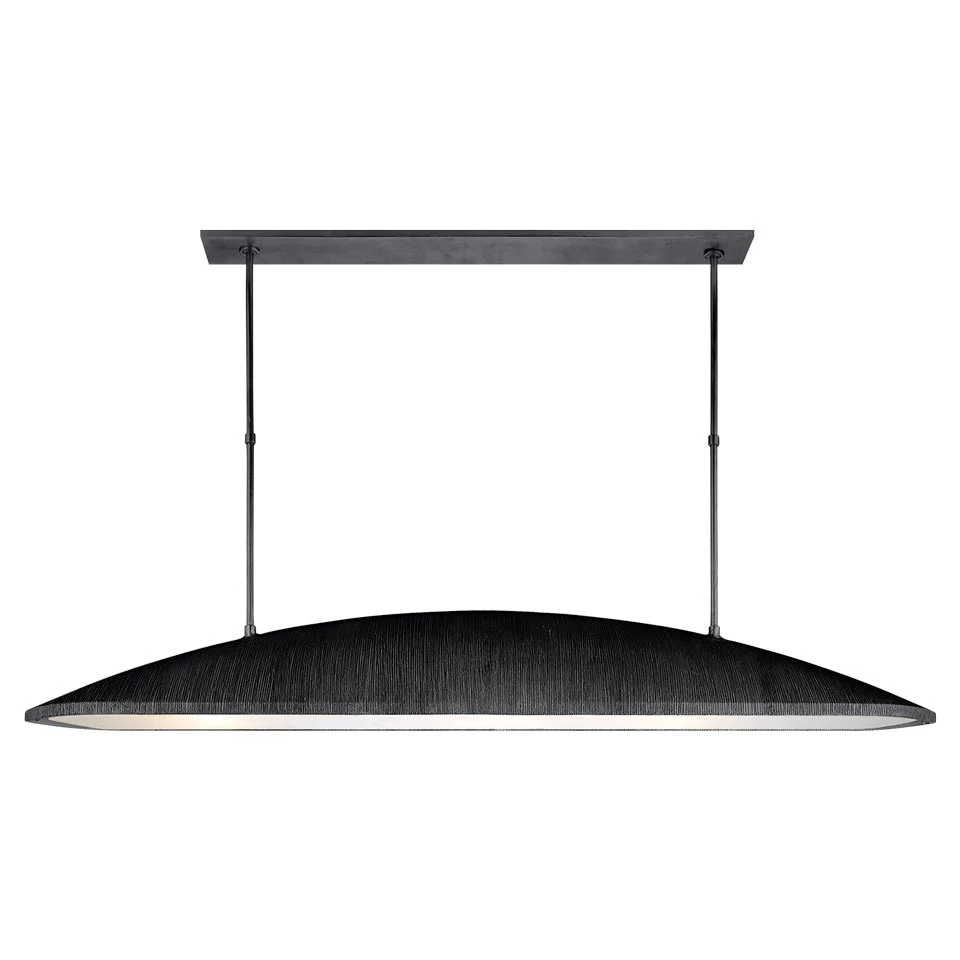 Superbe suspension longue Utopia en métal patiné noir qui séduit par son format épuré et son design minimaliste, avec cette forme de dôme sculpté sur toute la surface noire. Le modèle se compose d’un dôme de bronze sculpté de rainures régulières sur toute sa surface en finition patiné noire fixée à un support de plafond rectangulaire fin tout en longueur par 2 tiges de suspension. Le diffuseur placé à l’intérieur du dôme est en acrylique dépoli, et permet la propagation d’une lumière homogène et agréable sur une vaste surface, faisant du modèle un parfait luminaire au dessus d’une grande table ou un ilot. Ce luminaire est une création de la célèbre designer américaine Kelly Wearstler qui collabore avec la marque depuis de nombreuses années.