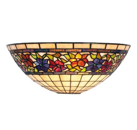 Cette applique Violette est de style Tiffany et comprend 179 pièces assemblées à la main. Le motif Violette est en verre crème légèrement jaune paille avec motifs floraux bleu violet, oranges et rouges sur fond de feuilles vertes. Il y a dans la même gamme Violette deux suspensions simples, une applique et deux lampes.