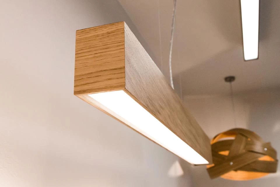 La suspension Linus Hang 110cm, de la collection WoodLED, est un rectangle tout en longueur en chêne, dans lequel est encastré une module LED de haute qualité ( CRI>90) sous un diffuseur blanc, qui assure une lumière uniforme et puissante. Le luminaire est suspendu par deux câbles métalliques fins à un tasseau de bois au plafond. Son format en horizontal en fait un modèle idéal pour éclairer de grandes tablées dans une salle à manger ou des bureaux. Le câble d’alimentation électrique est noir par défaut, mais il peut être choisi transparent, blanc, rouge ou marron sur simple demande à formuler dans les instructions spéciales du bordereau de commande. Le driver est intégré et compatible avec un variateur de lumière DALI .